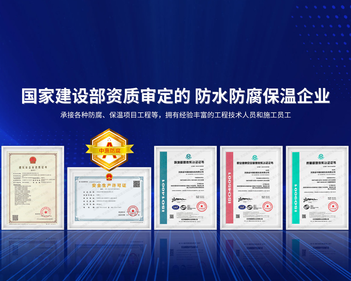 公司經營范圍:防水防腐保溫工程;消防設施工程;建筑裝修裝飾工程;建筑機電安裝工程;電力工程;建筑工程;石油化工工程;工業清洗工程;油罐清洗工程;鋼結構工程;環保工程;模板腳手架工程;電纜防火封堵、防污閃噴涂、外墻外保溫工程;各類施工勞務作業;設備維修、船舶鉚焊、涂裝;電力工程材料、建材、防水材料、防火材料、防腐保溫材料銷售,并相繼通過了GB/T19001-2008idtISO9001:2008GB/T50430-2007質量管理體系認證證書。GB/T24001-2004idtISO14001:2004環境管理體系認證證書。GB/T28001-2011idtOHSAS18001:2007職業健康安全管理體系認證證書。公司是中國防腐蝕于防護協會、中國施工企業管理協會、電力協會和中國鋼結構防水協會會員單位。 公司的經營業務涵蓋了石油、化工、電力、冶金、煤炭、船舶、國防、燃氣、水利、環保、交通運輸、航空及國防軍工和輕紡市政等行業的防腐保溫絕熱設備。鋼結構安裝、防火、防水、金屬噴鍍、聚脲噴繪、陰極保護、防滲透堵漏、玻璃鋼及各種磚版材料襯里、橡膠襯里、煙氣硫和耐酸溶劑腐蝕等工程施工。公司連續十年榮獲“省市先進施工企業”“安全生產先進單位”“重合同,守信用企業”和“AA***資質企業”的稱號。2000年被命名為市級文明單位,2002年被國家工商行政管理局命名為“重合同,守信用的企業”、被中國工業防腐蝕技術協會命名為“防腐蝕企業,能源節約及環境保護領域有豐富的經驗和***的業績。工程一次交驗合格率100%。其中攀枝花鋼鐵公司煉鐵廠四號高爐及熱風爐防腐工程、上海寶鋼公司煤氣柜防腐工程、撫順石油一廠裝置防腐項目、齊魯石化公司稀烴廠高塔防腐工程、吉林化學工業公司煉油廠油罐防腐工程、天津石化熱電廠六號爐頂棚聯絡管保溫工程、大慶油田(太倉)力神泵業工程、中國化學工程第十一建設工程、中原油田勘探局工程、中國石化銷售有限公司華北分部、魯皖輸油管道工程、貴州開磷息烽合成氨工程、陜西黃陵煤化工程、中國石油天然氣西部管道塔里木輸油工程、邯鋼集團邯寶鋼鐵公司煉鐵工程、德州供電工程、吉寶(南通)船廠工程,偃師華潤熱力工程、鄭州熱力總公司。 河南省中惠防腐安裝有限公司愿以豐富的施工經驗,***的技術,***的設備,***的管理,***的服務,竭誠為國內外廣大的用戶提供***滿意、******的工程作品。 我公司愿與國內外同仁一道,團結協作,共同推進防腐蝕行業發展! 公司地址:河南省長垣縣建設路北段360號 固定電話:0373-8866488 郵編:453400 網址:http://www_zhff_com_cn.shishanren.com